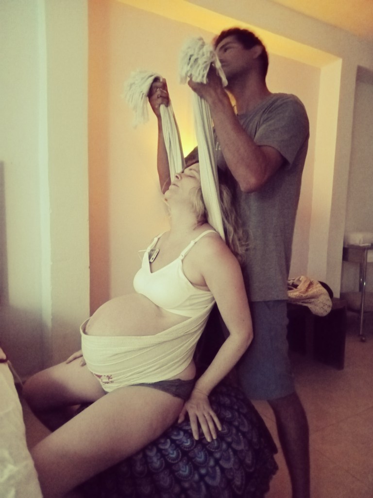 Durante el trabajo de parto, el rebozo puede servir a la partera para ayudar a acomodar a un bebé que no viene optimamente posicionado, como puede servir a la mujer pariendo para asirse y así ella mísma brindarse el soporte que necesita para ejercer la fuerza que el parto le pida.